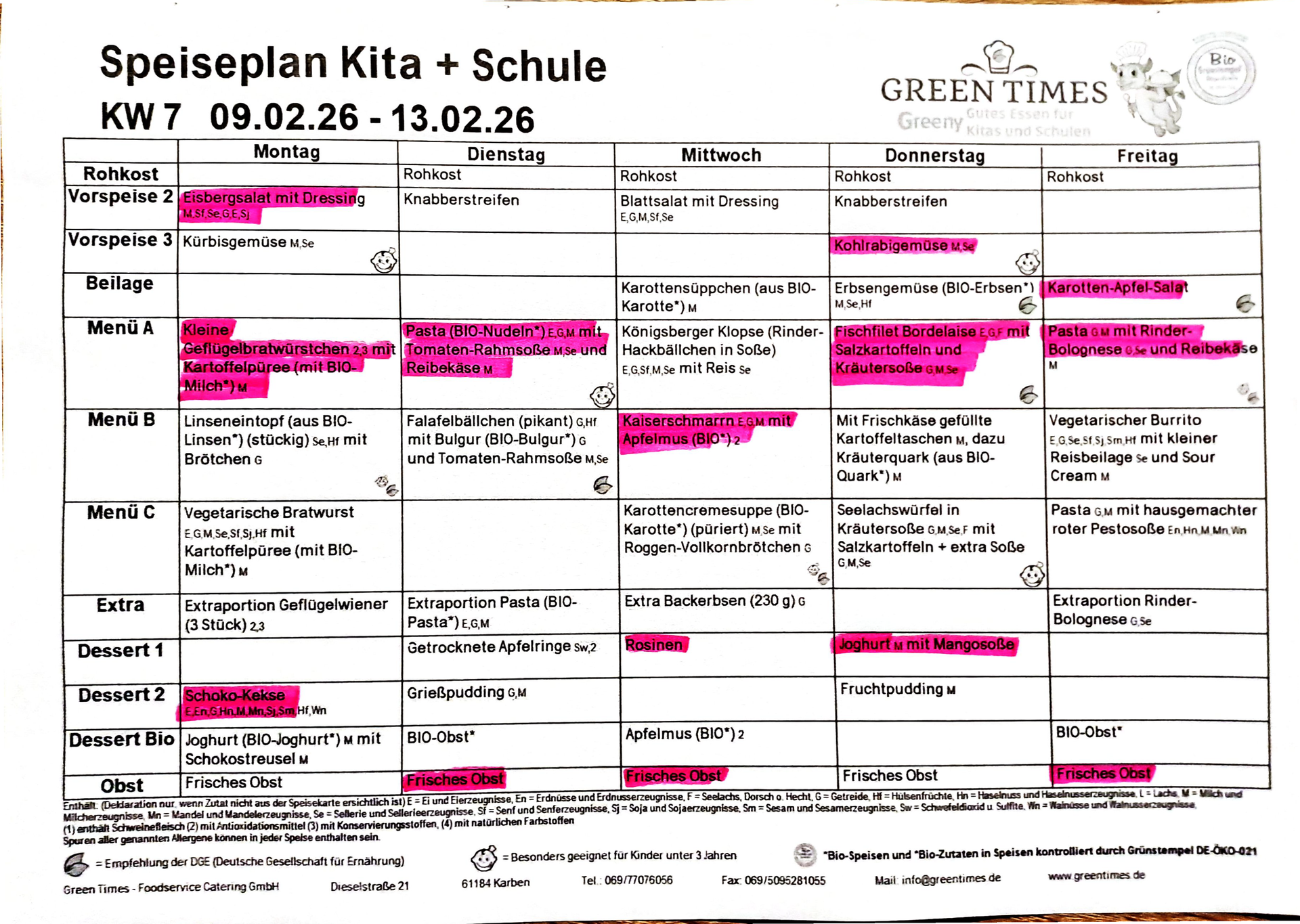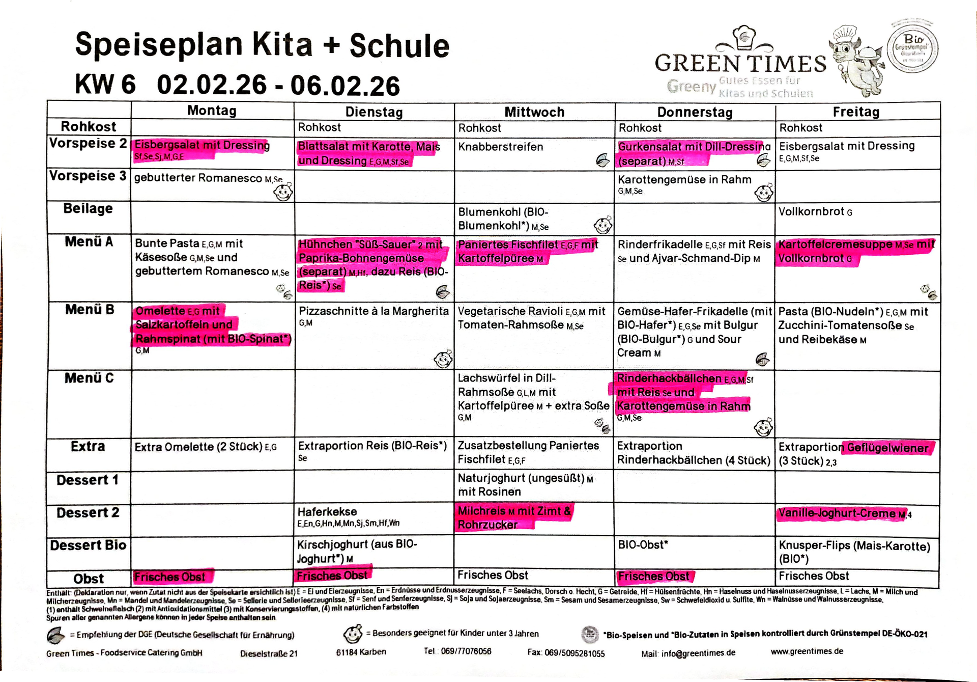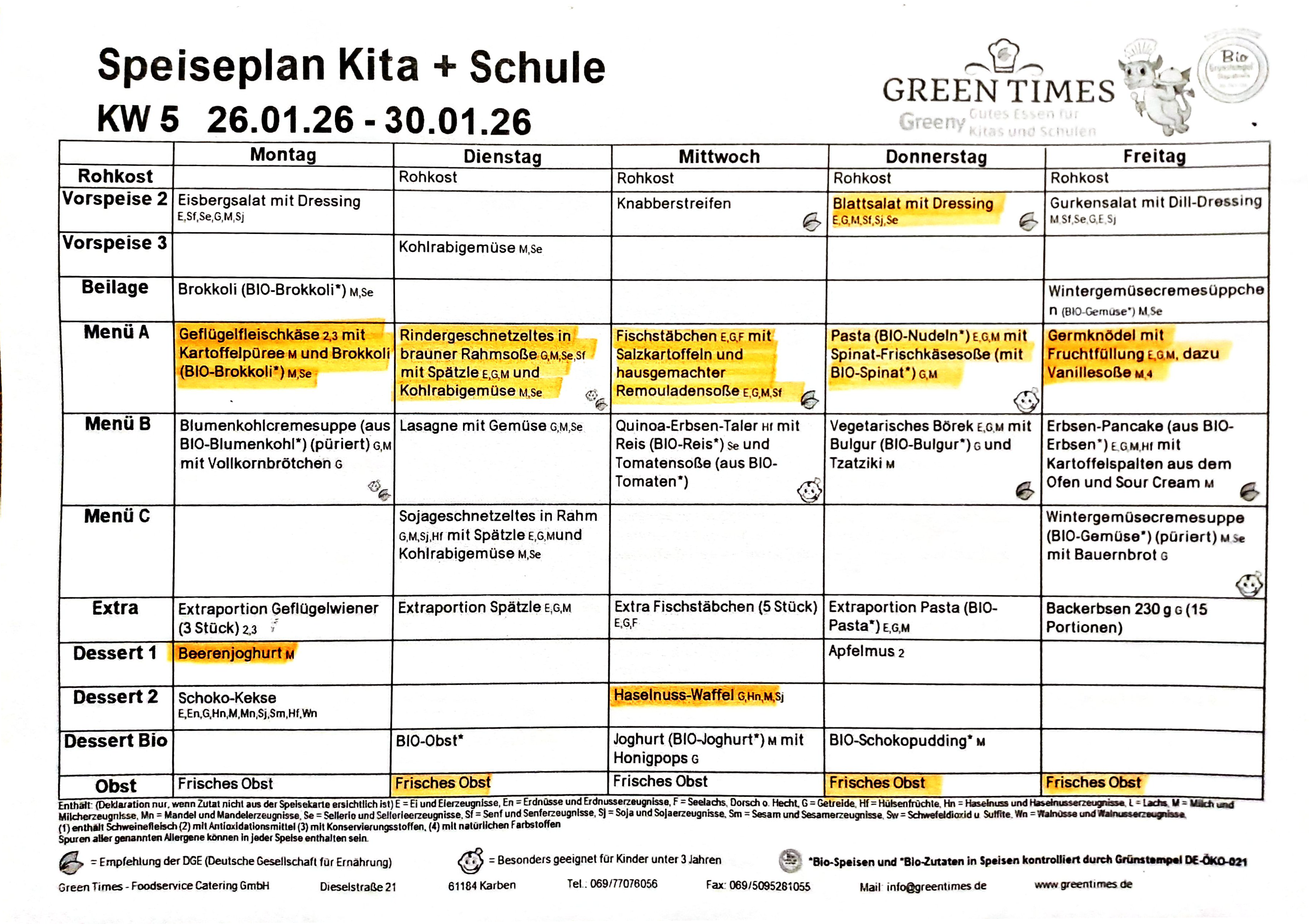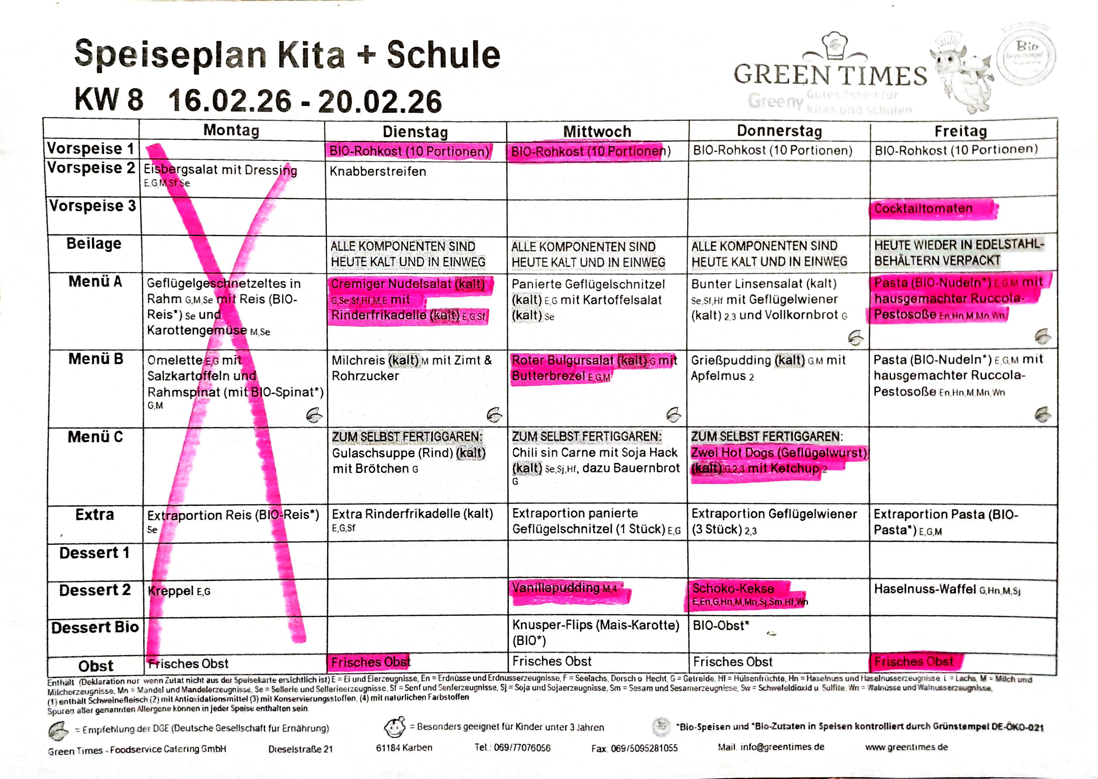 Essen allgemein: Seit vielen Jahren bestellen wir bei Greentimes. Angeboten wird ein sehr abwechslungsreiches und frisches Essen. Auf die Verwendung von Bioprodukten wird sehr viel Wert gelegt.